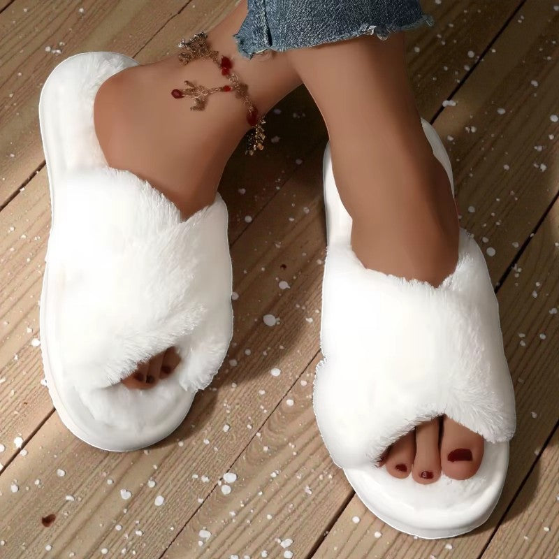Mysiga och lätta fluffiga slippers för kvinnor, perfekta för höst och vinter. Den öppna tån gör dem luftiga samtidigt som det mjuka plyschfodret håller fötterna varma. Stilrena och bekväma för både inomhusbruk och korta promenader, med halkfri sula för tryggt steg på alla golv.
